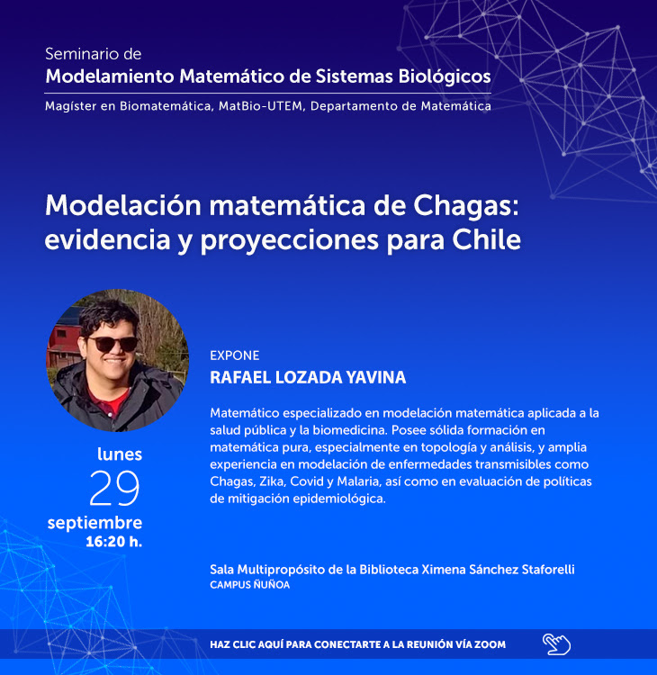 El Seminario Conjunto Uniquindío–UTEM en Biomatemática y Modelación Territorial, es una instancia académica periódica orientada a la difusión, discusión y fortalecimiento del modelamiento matemático y estadístico aplicado a sistemas biológicos. Además corresponde a la primera acción de cooperación entre ambos programas de postgrado con miras a la firma de un convenio de colaboración.